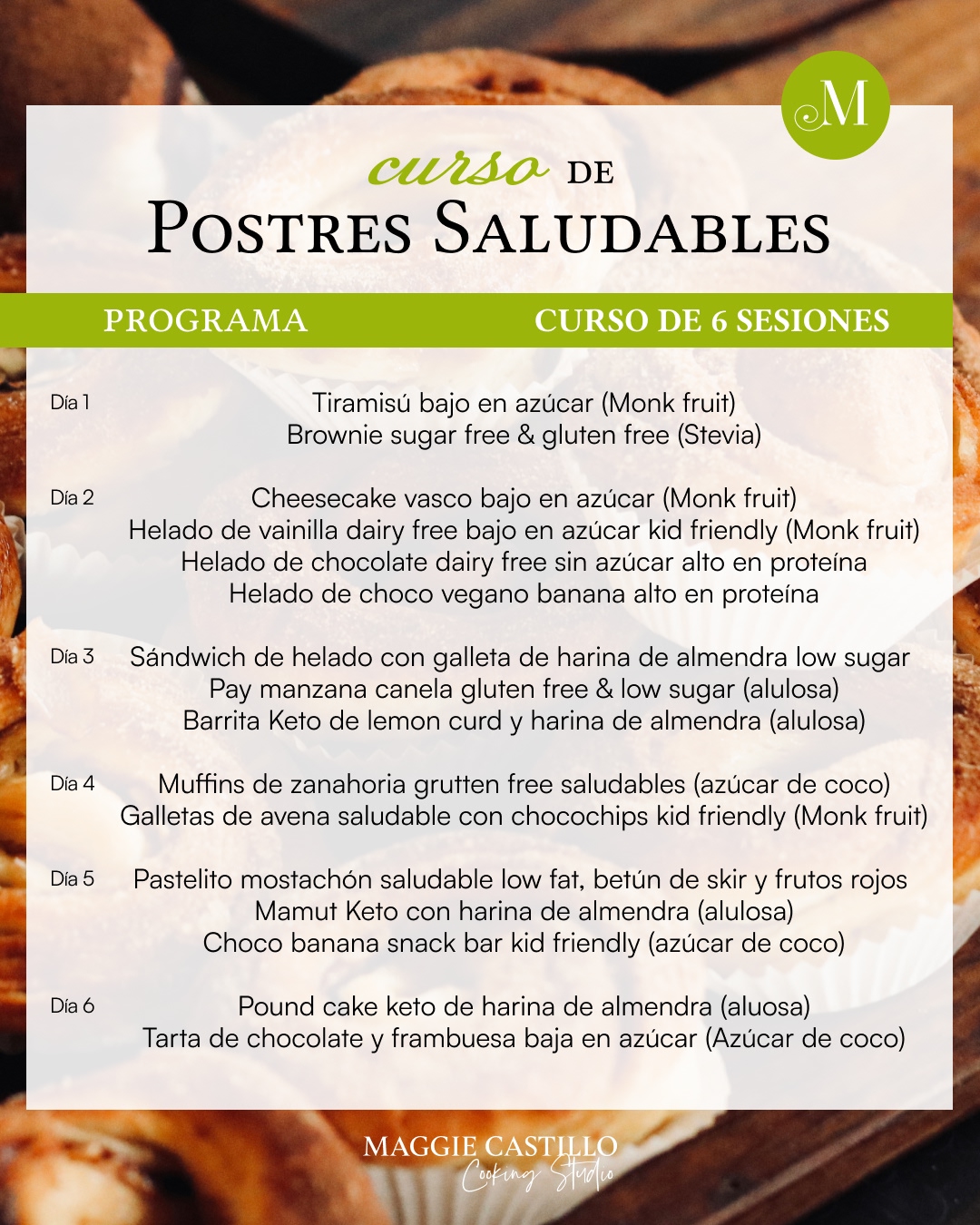 CURSO DE POSTRES SALUDABLES Taller de cocina 100% práctico conformado de 6 sesiones de una frecuencia semanal de 2.5 horas aproximadamente donde aprenderás cocinando por ti mismo,