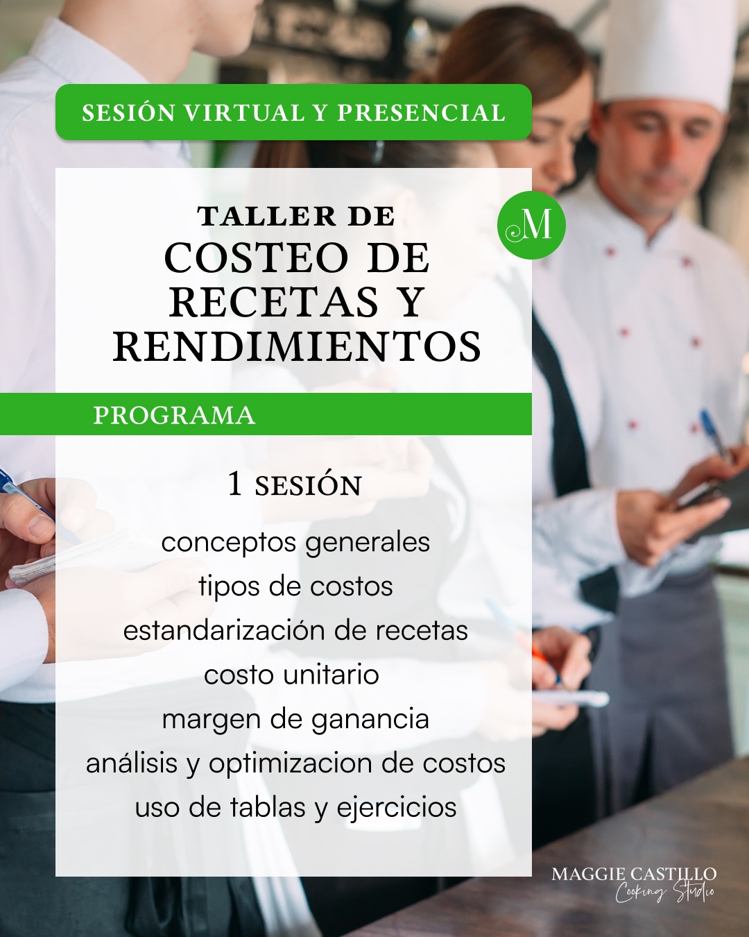 Es un curso de una sesión presencial o virtual de 3 horitas en la cual aprenderás, de la mano de un chef ejecutivo experto, a costear las recetas